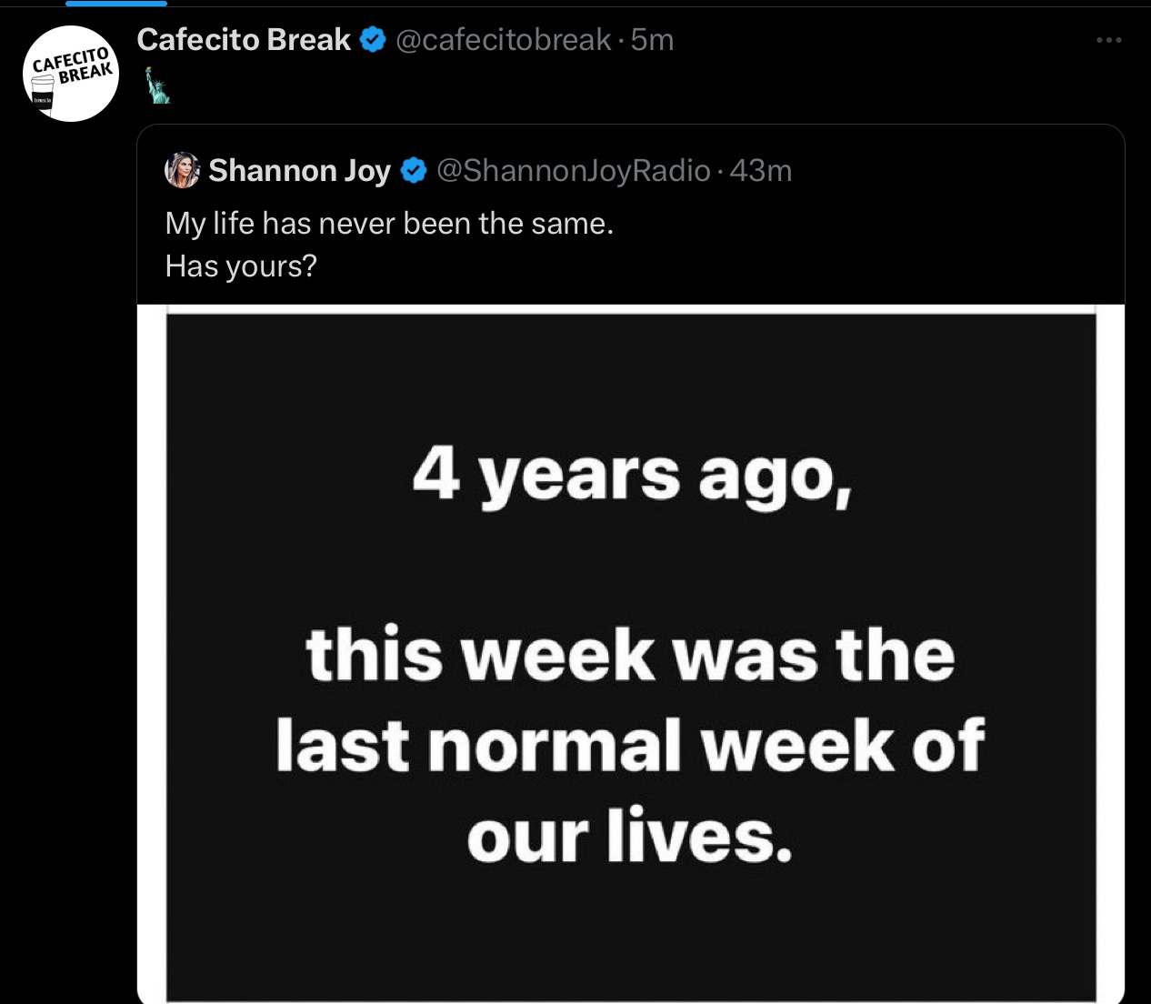 "4 years ago this week was the last NORMAL WEEK of our LIVES...."