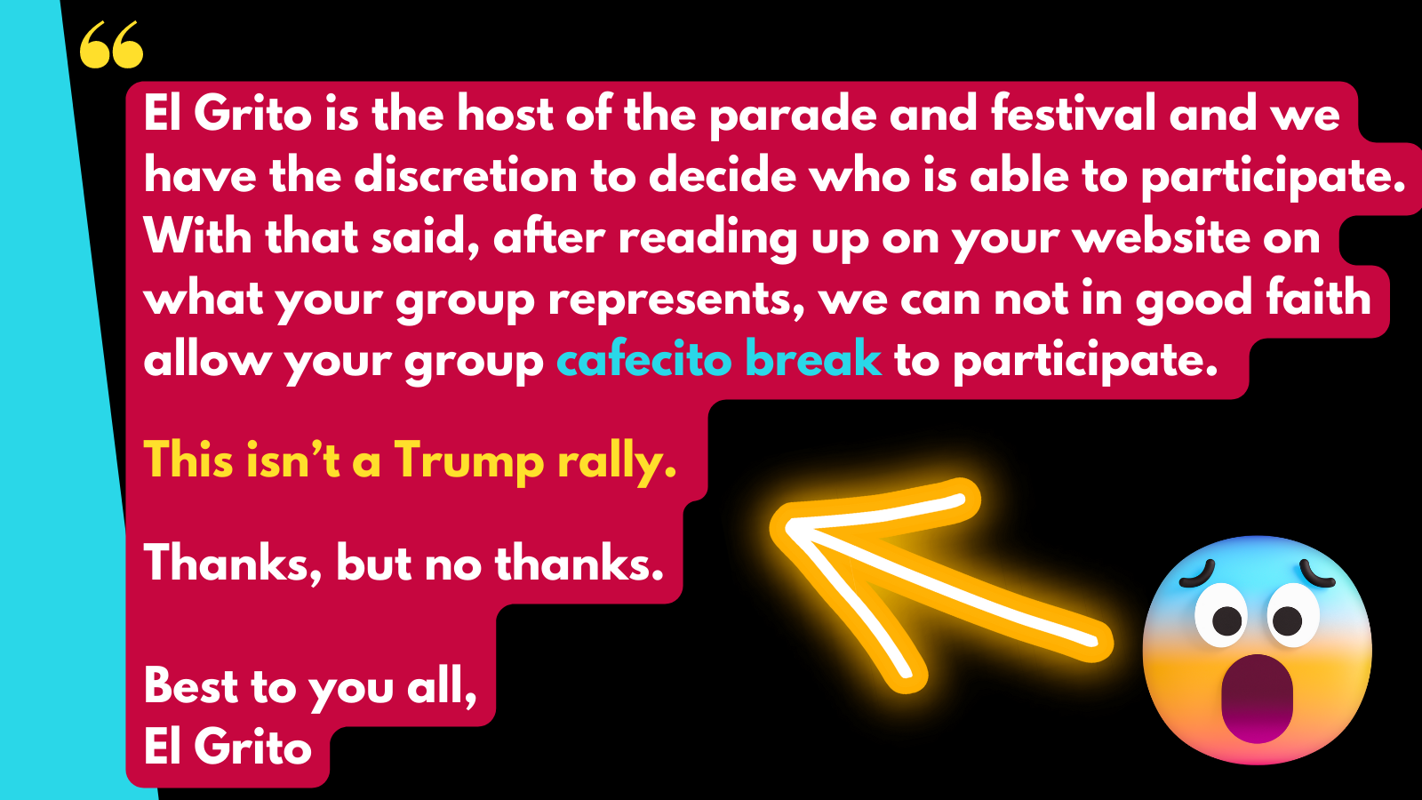 🚨 A few weeks ago we shared with you that we “Cafecito Break” were not permitted to March at the Sunset Puerto Rican Day parade because the leader of the organization reduced all of Cafecito Breaks 12 year history of indie media community wellness to a Trump Rally.
