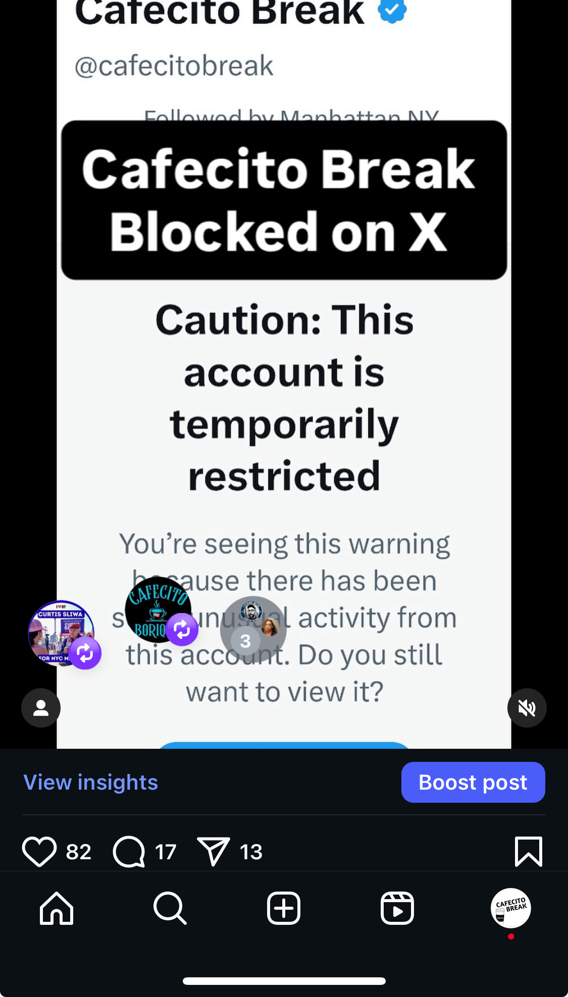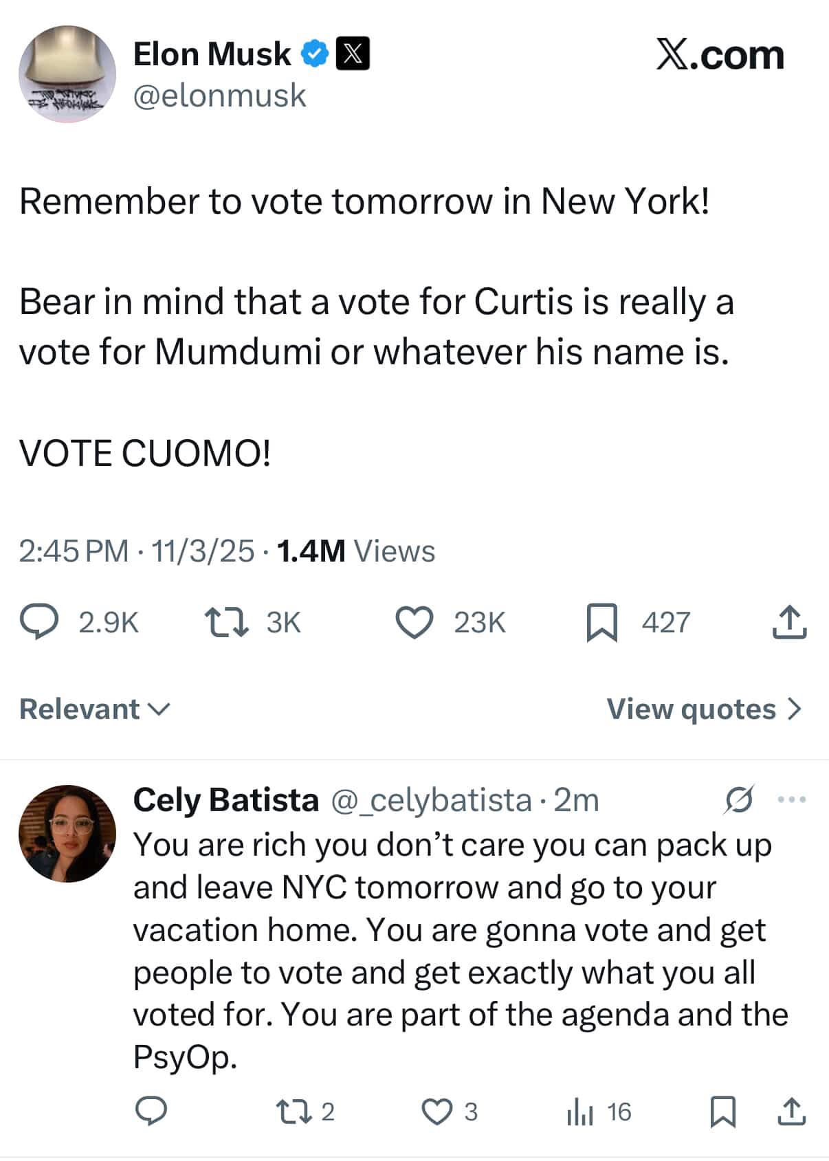 called it out as potential interference against pro-Sliwa, grassroots Hispanic media ahead of the election. Monday Endorsements: Both Elon Musk and Donald Trump jumped in backing Cuomo late in the day. Musk posted: “Remember to vote tomorrow in New York! Bear in mind that a vote for Curtis is really a vote for Mumdumi or whatever his name is. VOTE CUOMO!”— ...... This whole saga highlights how precarious visibility is on X during high-stakes races—throttling can bury important local journalism like yours without a trace. Your Cafecito Break content (interviews, event coverage) is valuable indie media, and it’s wild it got caught in this.”