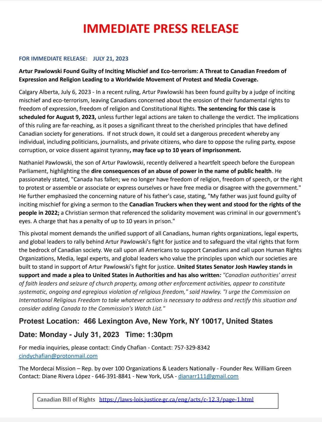 JOIN US The Perez Sisters and freedom friends at Canadian Embassy Monday for a protest / “Outcry Gathering” to make our voices heard on behalf of Pastor Pawlowski which will take place Monday, July 31, 2023, at 1:30 pm.