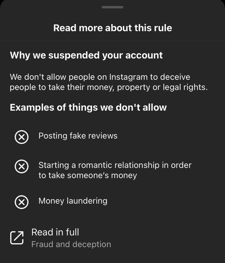 “We don’t allow people on Instagram to deceive people to take their money, property, or legal rights”